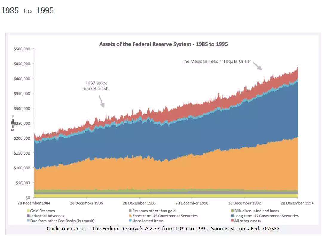 在1965年之后,这一趋势越发明显。尤其是80年代里根宣布“星球大战计划”继而美苏军备竞赛加剧后,美国的公债规模进一步增加,有理由认为,联储为了在公债供给增加而对利率和通胀造成影响的环境下实现其政策目标,很可能被迫提高了资产端的公债占比(通过针对银行系统的公开市场操作):