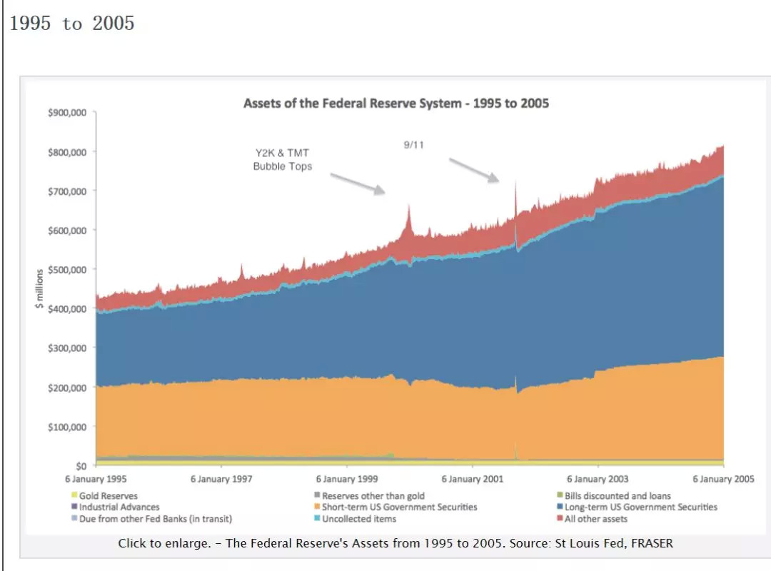 如上图所示,到了危机前的2005年,美联储资产端中的黄金储备占比已经微乎其微。公债,尤其是长期公债,成为了联储资产端中的主导。