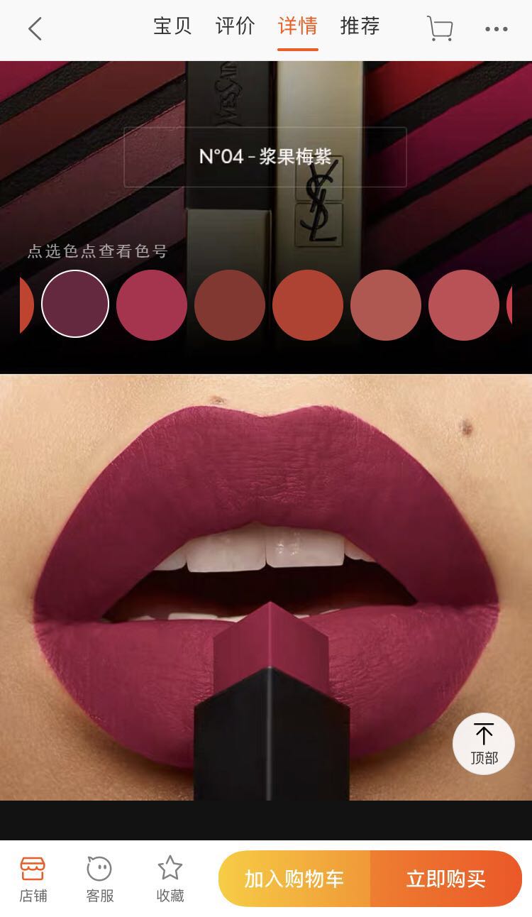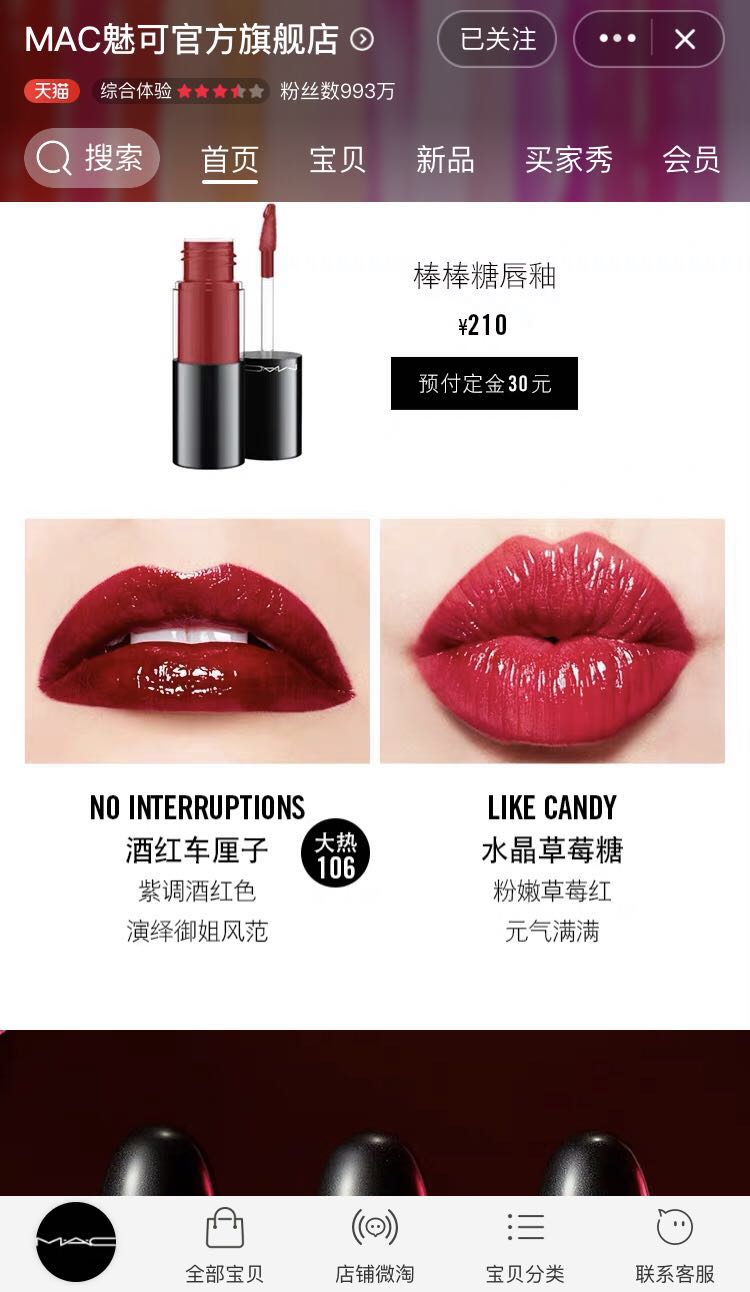 YSL在天猫店上采取了动态展示的方式,消费者通过点击色号,便能看到不同颜色在嘴唇上的效果。M.A.C的天猫店则是用选色卡、在线BA咨询等方式为线上消费者提升试色体验。