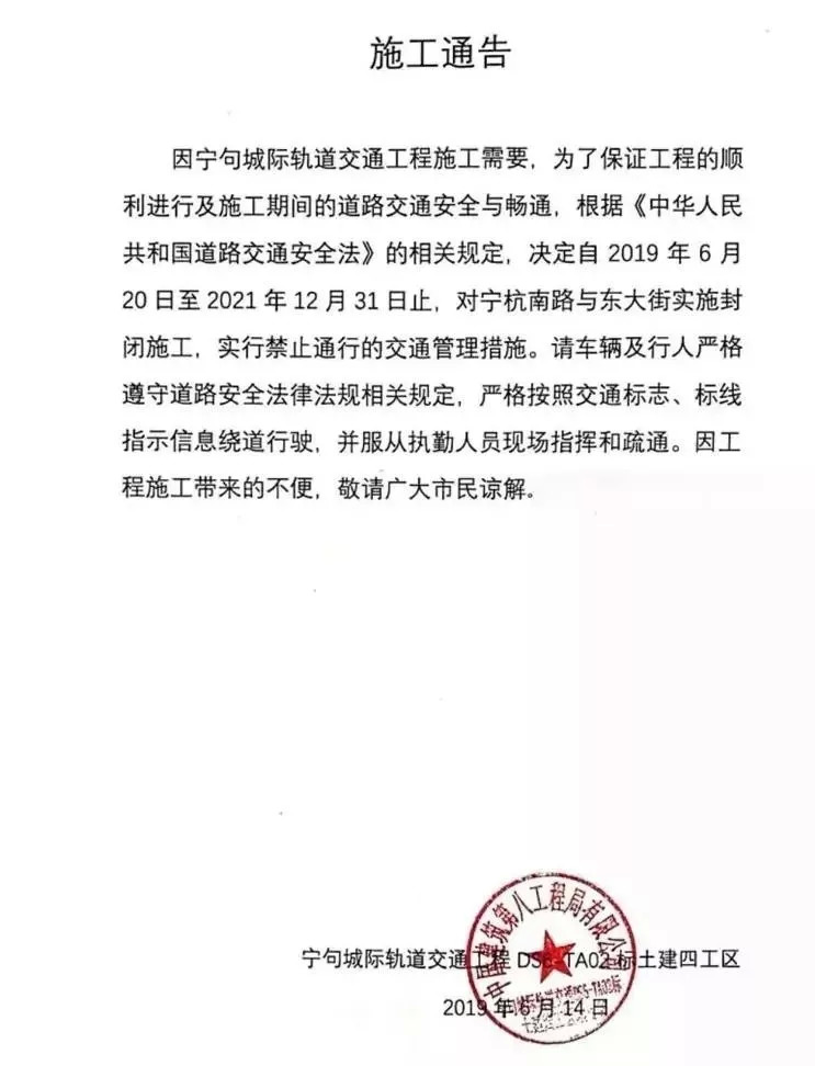 根据《中华人民共和国道路交通安全法》的相关规定,从2019年6月20日起,到2020年12月31日为止,对宁杭南路与东大街实施封闭施工,施行禁止通行的交通管理措施。