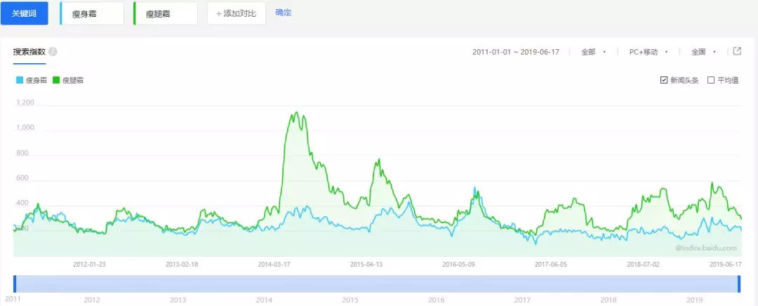 据百度指数显示,“瘦腿霜”与“瘦身霜”这两个关键词,虽搜索热度的变化规律相当,一般在每年的3月到9月期间迎来搜索高峰;但瘦腿霜的热度明显比瘦身霜要高,并且瘦腿霜曾在2014年4月微商开始爆发之际达到最高峰。