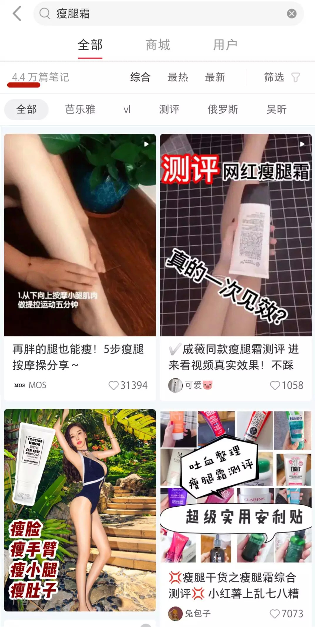 目前,在小红书搜索关键词“瘦腿霜”,相关笔记多达4.4万篇。据了解,瘦腿霜产品在使用时,一般是先将产品涂抹在想要瘦身的部位,如:腿部、腹部、手臂等,然后通过按摩促进产品吸收,最后再在涂抹产品的部位裹上一层保鲜膜,此举据称是为了促进脂肪分解,从而达到局部瘦身的目的。