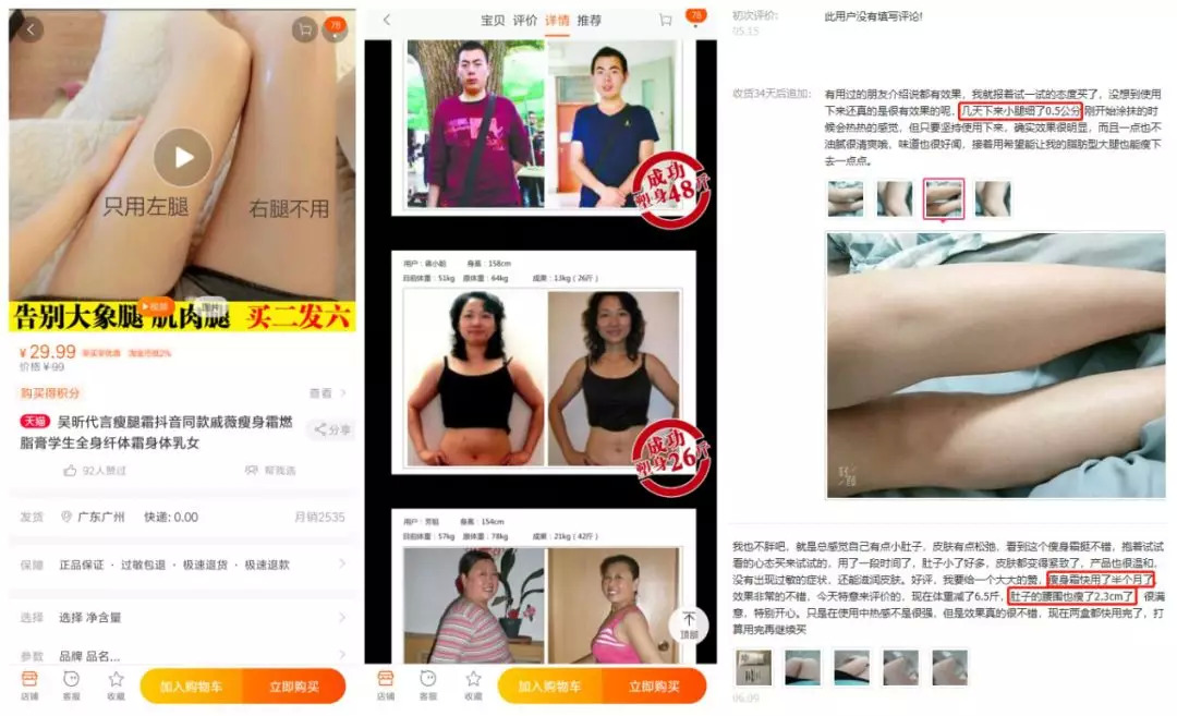 事实上,瘦腿霜类产品之所以能热销,最大的亮点在于其产品大多宣称无需运动、无需节食,坐着、躺着就能变瘦,是大部分人梦寐以求的“理想减肥法”。在产品详情介绍以及购买评论里,还配有真人瘦腿、瘦身前后的对比图加以佐证,从而让消费者对此类产品的使用效果充满美好幻想。