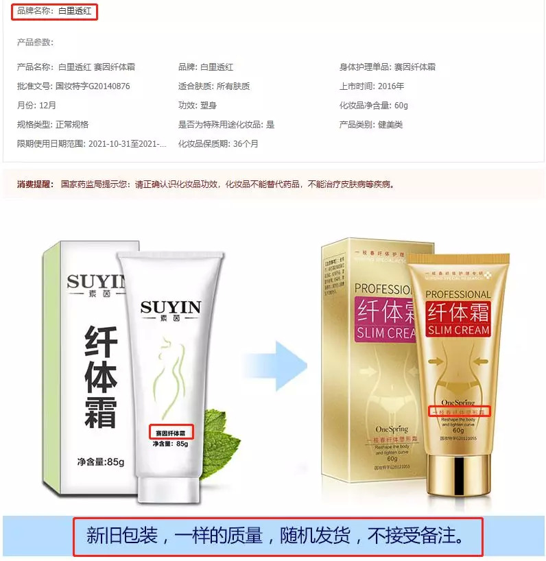 对此,多位业内工程师表示这是明显的“套牌”行为。此外,生产批号为国妆特字G20140876的“白里透红赛因纤体霜”,在该产品详情介绍页显示“新老包装随机发货”,但其所谓的“新包装”,除了产品包装不同以外,产品名称也发生了变化。对此,有工程师直言,特证化妆品讲究“一品一证”,因此,同一个特证下,即便是产品更换包装,也不能更换产品名称。