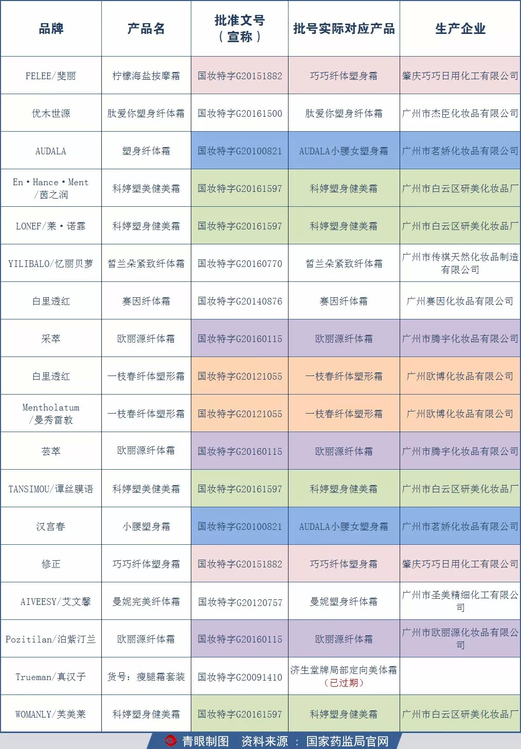 “FELEE柠檬海盐按摩霜”与“修正巧巧纤体塑身霜”的生产批号均为“国妆特字G20151882”;“AUDALA塑身纤体霜”与“汉宫春小腰塑身霜”的生产批号均为“国妆特字G20100821”;“En·Hance·Ment/茵之润科婷塑美健美霜”“LONEF/莱·诺霏科婷塑身健美霜”“TANSIMOU/谭丝膜语科婷塑美健美霜”与“WOMANLY/芙美莱科婷塑身健美霜”的生产批号均为“国妆特字G20161597”;“采萃欧丽源纤体霜”“芸萃欧丽源纤体霜”与“Pozitilan/泊紫汀兰欧丽源纤体霜”的生产批号均为“国妆特字G20160115”;“白里透红一枝春纤体塑形霜”与“Mentholatum/曼秀雷敦一枝春纤体塑形霜”的生产批号均为“国妆特字G20121055”。