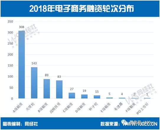 融资轮次上看,A级融资达308起,占比44.77%;天使轮达143起,占比20.78%;B级融资89起,占比13.94%;战略投资83起,占比13.64%,此外,C级融资27起,D级融资19起,种子轮15起,E级融资5起,F级融资3起,IPO上市后1起,未透露4起。不难发现,2018年电子商务投融资基本集中于天使轮、A轮及B轮。投融资越到后期越发困难,越发考验平台的商业模式的成熟性与可发展性。