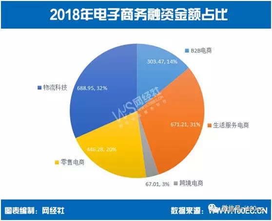 融资金额方面,2018年电子商务投融资金额2196.92亿人民币,其中物流科技688.95亿人民币,占比32%;零售电商446.28亿人民币,占比28%;生活服务电商671.21亿人民币,占比31%,B2B电商303.47亿人民币,占比14%;跨境电商67.01亿人民币,占比3%。