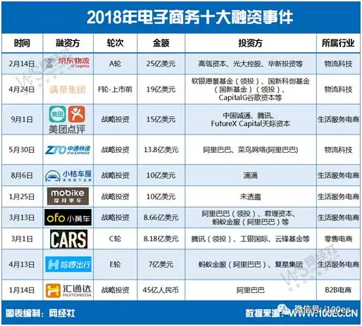 此外,据网经社(100EC.CN)统计结果显示,2018年电子商务十大融资事件总金额达849.82亿人民币,京东物流、满帮集团、美团点评、中天科技、小桔车服、摩拜、ofo、车好多、哈啰出行、汇通达上榜。