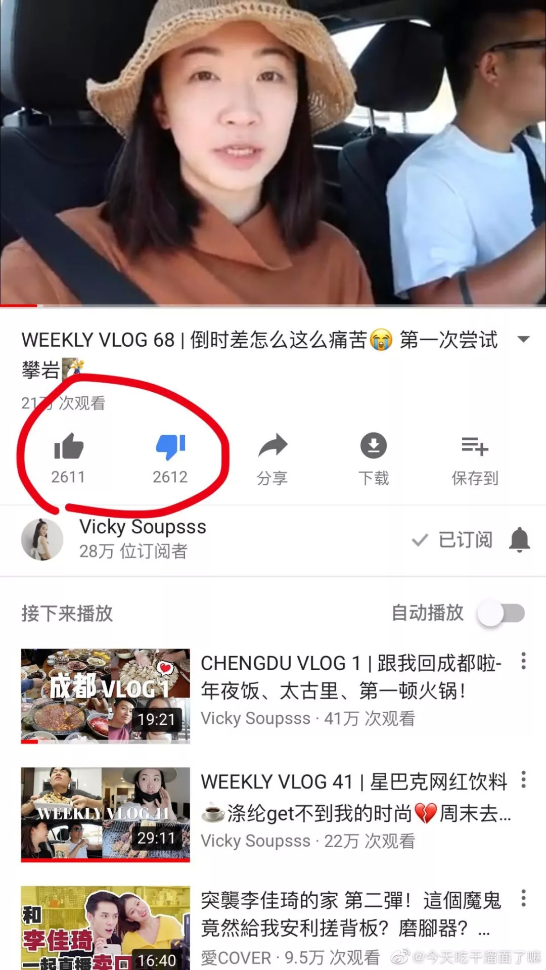 其次,当博主开始不断推出广告视频,将情感记录变成花式产品推广时,粉丝也将从心甘情愿关注博主“吃狗粮”变为转向观看其他同类型博主的视频。“暗广”问题在许多B站博主的视频中表现十分突出,早前UP主“Vickysoupsss”便因为在夫妻日常vlog中频繁插入暗广,最终面临着大批的脱粉回踩,在YouTube平台发布的视频也呈现出讨厌视频的人数超过喜欢视频的人数的趋势,最终选择近期停更视频。