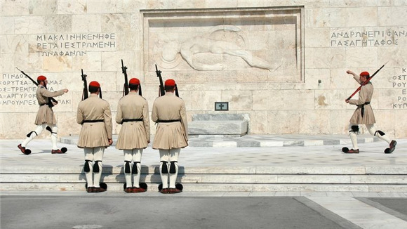 希腊雅典的宪法广场矗立着一座无名烈士墓。希腊精锐步兵部队“Evzones”的士兵负责守卫。烈士墓的背景是一幅大理石画副本,画着一位死去的古希腊公民战士,躺在一块平板上。