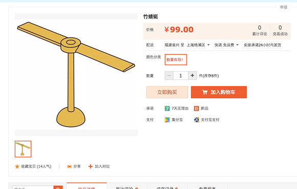 以竹蜻蜓为例,淘宝上出售的“竹蜻蜓”看起来更像是一个“有人机”,具体规格是:“有效时间八小时,最高时速是八十公里每小时,之后电池便会用尽。”