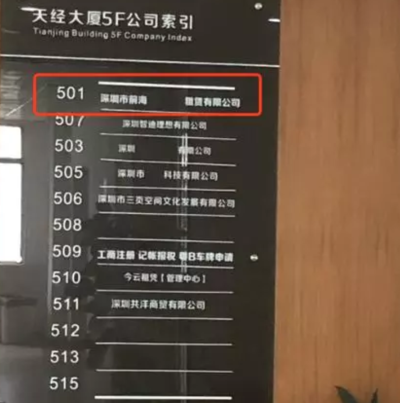 在另一块指南上,501室则显示为被涂抹过的“深圳市前海****租赁有限公司”字样。涂黑字的部分可能是“途歌汽车”。来到501室的经营场所,发现已经换成一家贸易公司,当向办公室及入驻企业询问途歌深圳公司的去向是,所有人都表示不清楚。