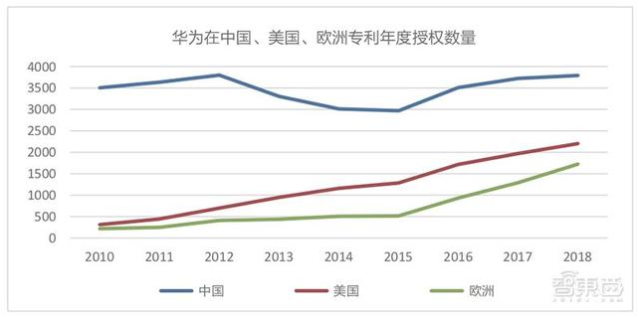 华为2010~2018在中国、美国、欧洲授权专利数据如下: