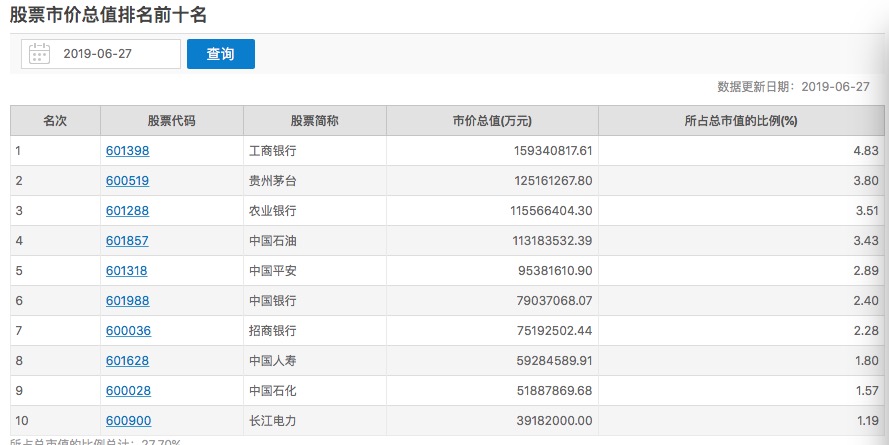 从流通市值来看,根据上交所6月27日数据,贵州茅台目前流通市值排名上交所第二,也是A股第二。第一为工商银行(601398.SH),流通市值1.59万亿元,占总市值的4.83%;贵州茅台总市值1.25万亿,目前全流通,占总市值的3.80%;农业银行(601288.SH)流通市值1.16万亿,排名第三,占总市值比达3.51%。