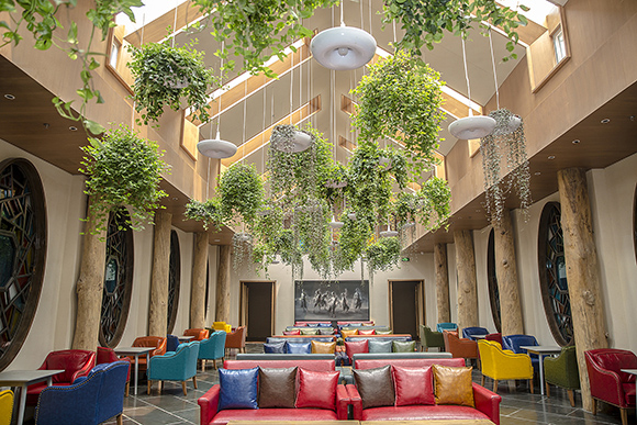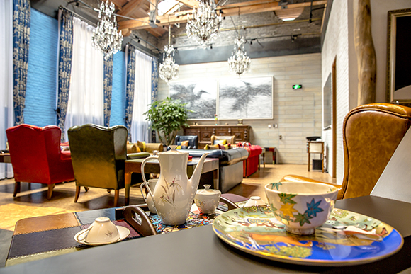 会所是一栋老房子,王长田进行了翻修和功能改造,装修风格也体现了他个人的审美偏好,彩色的沙发,颜色鲜艳的角柜,中式和西式混搭的各种家具。王长田说这个会所的装修是他自己设计的,所有的画也都是自己亲自挑选。他觉得他要是不做电影的话,做设计师也能混口饭吃。
