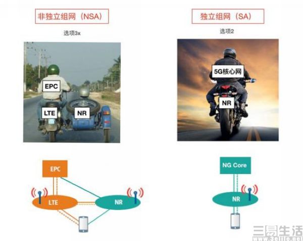 想要实现5G网络,就需要重新部署网络。目前业界有两大不同的组网选项——SA和NSA,即独立和非独立组网。二者的区别就是,SA的5G核心网射频无线网都是需要新建的,而NSA则是使用4G核心网、4G无线网、5G无线网。