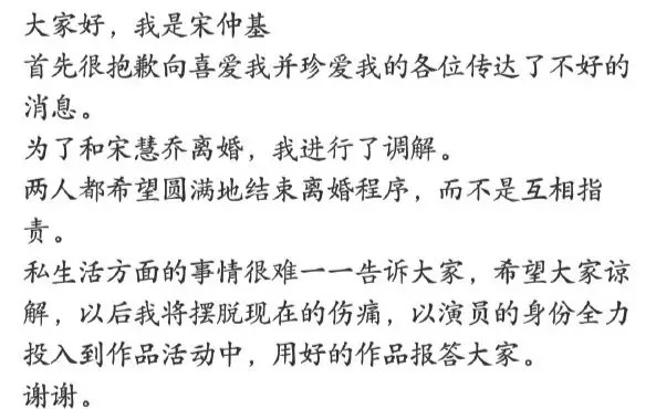 早上,宋仲基所属经纪公司表示:“关于宋仲基演员离婚的正式立场。宋仲基和宋慧乔经过慎重的考虑,决定结束婚姻生活,经过圆满的协商正在办理离婚手续”。声明中,宋仲基率先发声,表示希望能友好结束婚姻关系。