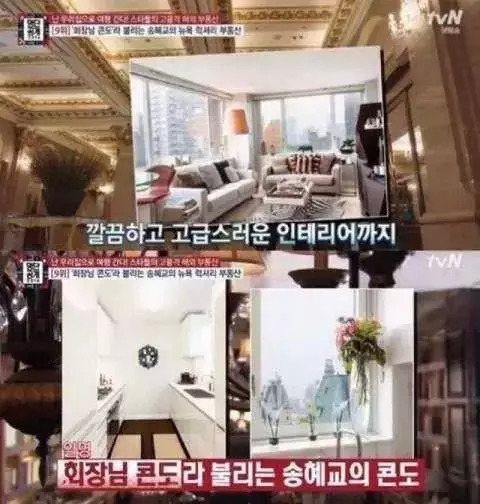 当时韩国媒体借此机会,对宋慧乔的房产等财产状况进行了调查,由此发现其雄厚的资产和投资房产的远见。随后她曾在“拥有海外房产明星排行榜”中被列为第9名,不仅多次在首尔各地置产,还曾一次性现金付清174.6万美金,购置下纽约曼哈顿某处的豪宅,却几无投资失手的前例。如韩国房地产专家曾在节目中表示,其2004年50亿韩元买入的别墅,于2016的市价已涨至100亿韩元,其纽约的那处房产,则在八年间升值到280万美元。