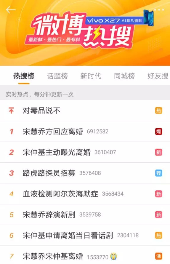 6月27日的微博热搜榜,一改多日以来的沉寂。晚间“范冰冰、李晨官宣分手”的消息,更是为大家熊熊燃烧的八卦之魂再添一把新火。但今天上午,几乎被宋慧乔和宋仲基联手承包的热搜盛况,依然存在感十足。