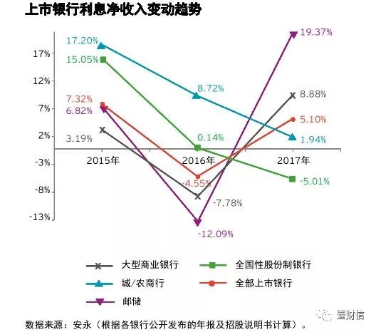 根据安永出具的《中国上市银行2017年回顾及未来展望》研究报告,上市银行2017年实现利息净收入合计人民币31,197.08亿元,同比增长5.10%,城/农商行利息净收入同比增长1.94%。
