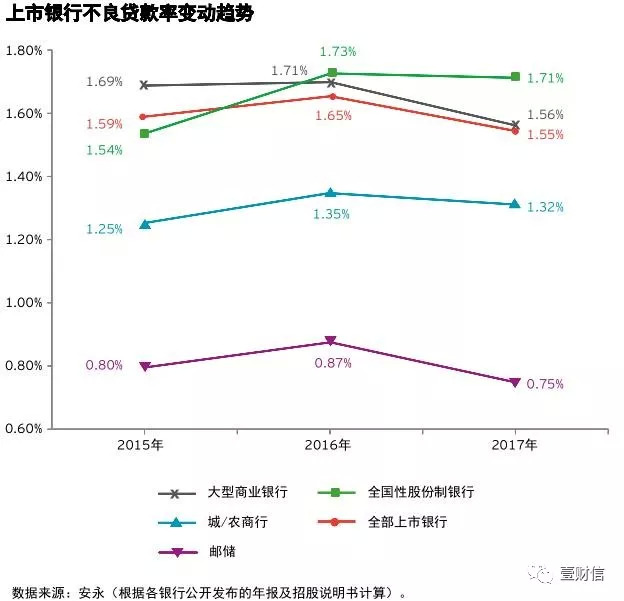 据《中国上市银行2017年回顾及未来展望》数据,2015-2017年,城\农商行的不良贷款率分别为1.25%、1.35%、1.32%。