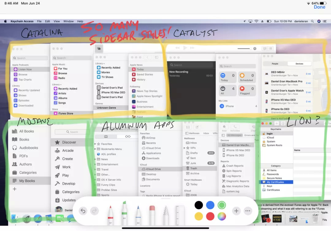 即便如此,苹果也由于长期的历史积累,至今仍存在不同地方设计风格不统一的问题。例如,在最新测试版 macOS Catalina 中,窗口样式出现了几种外观同时并存的局面,甚至有些还继承自 2011 年的 OS X Lion。[3]