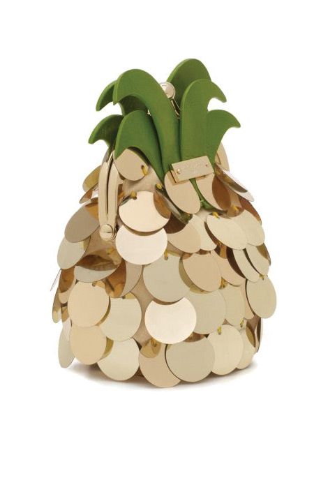 另一只值得关注的水果造型包袋则来自Kate Spade。设计师在水桶包的基础上,用金黄色亮片和墨绿色皮革搭配,创作出了一只活泼并带有派对气息的菠萝。