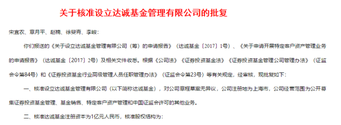 公告显示,达诚基金注册地为上海市,公司经营范围为公开募集证券投资基金管理、基金销售、特定客户资产管理和中国证监会许可的其他业务,注册资本为1亿元人民币。