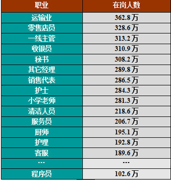 也不要寄托希望于会有新行业产生带来福音。1776年美国只有几十种职业,但一百多年后,现有的几百种职业中,新兴行业创作的工作机会所占比例微不足道。运输、零售店员、普通主管、收银、秘书、销售代表、护士……用人最多的这些职业在过去几百年前就以某种方式存在,而这些差不多全是自动化很轻易能取代的工作。直到第33位,才出现一个全新的职业:程序员。