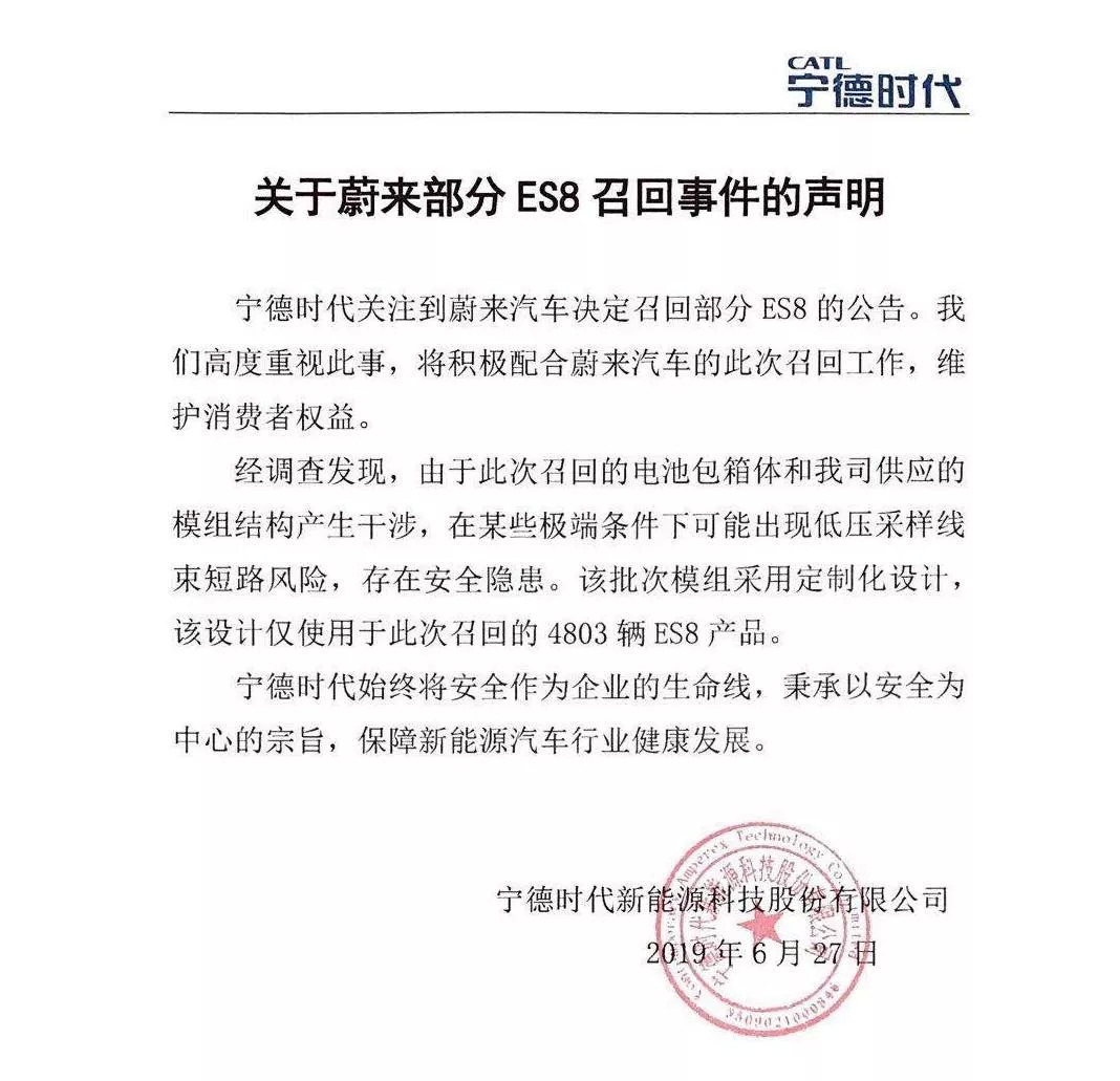 同样出人意料的是,在蔚来发布召回声明之后,其NEV-P50电池模组的供应商宁德时代也发布了一则声明,与蔚来的声明在电池起火责任归属问题上出现了矛盾。