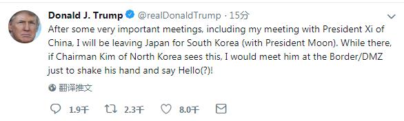 特朗普在推特上称,“在一些非常重要的会晤,包括与中国国家主席习近平的会晤后,我将离开日本,(和文在寅总统一起)前往韩国。在那儿的时候,如果金正恩委员长可以看到这一切,我想和他在(朝韩)边界/非军事区见一面,只为握个手说声你好(?)!