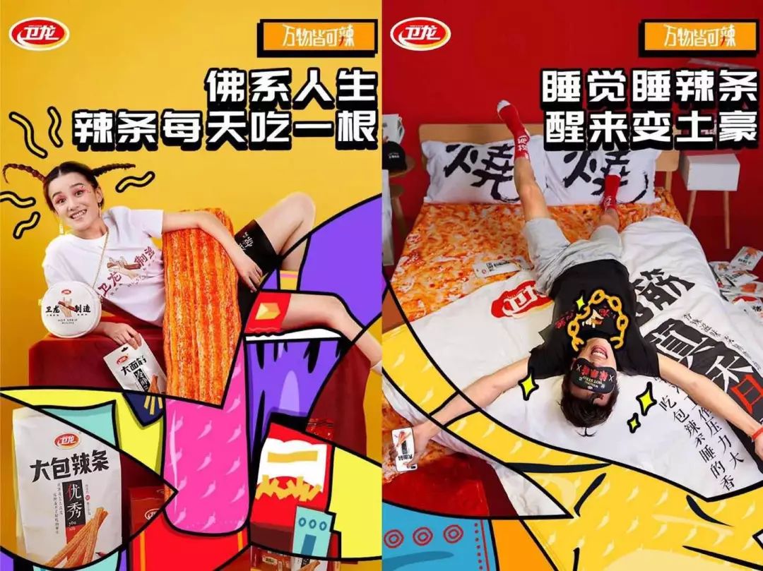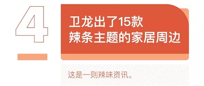 卫龙推出了包括“火辣辣床上四件套”“辣条抱枕”、“辣眼睛眼罩”在内的15款家居周边。看到1米2的抱枕和辣片床单、面筋被套,一种“辣条世家的公子在 500平米的辣条图案大床上醒来,摘下辣条眼罩,踢掉辣条抱枕”的富贵之感油然而生。不知道是不是真的有人会把他们买回去……