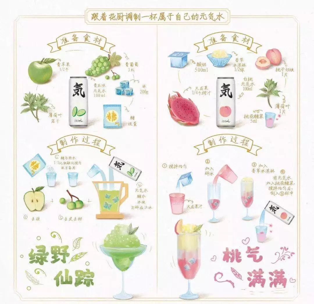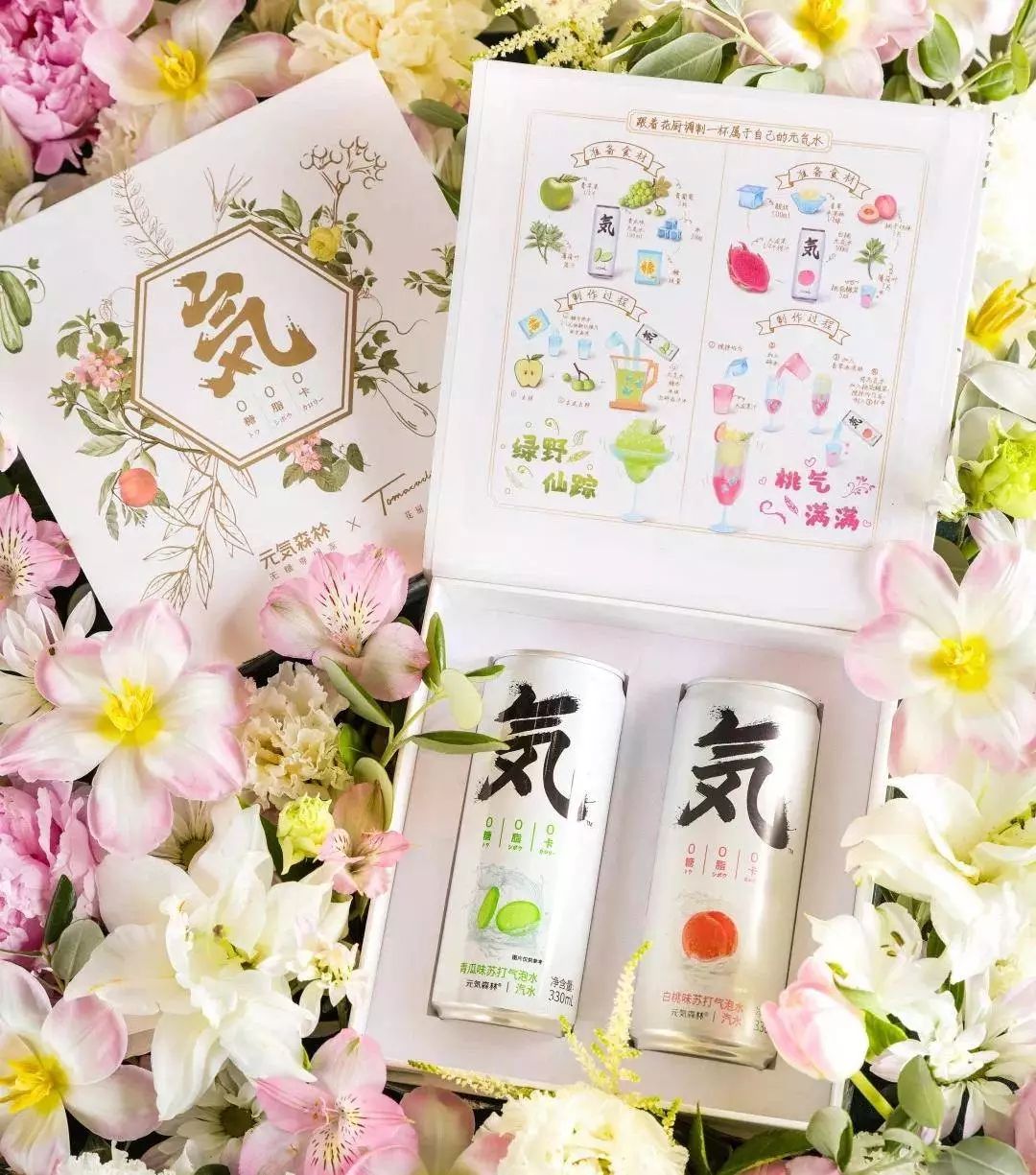 元气森林携手北京西餐厅花厨推出花气礼盒。盒子里分别是青瓜味气泡苏打水和白桃味气泡苏打水,按照盒子上的指示,你可以自己在家调制清凉夏日特饮——“绿色仙踪”和“桃气满满”。因为是限量款,你在花厨店内消费满388元才能得到一份花气礼盒,也可以直接买元气森林气泡水,按照下图指示,自己在家DIY。