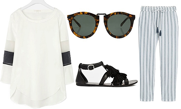一般情况下,为了寻求视觉上的和谐,无袖衫往往会搭配长裤,所谓上短下长,比如日日的这身: