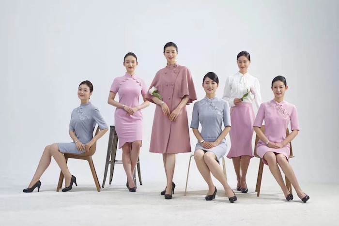 制服由中国服装高定设计师郭培操刀设计,以低饱和度色系为主色调配合凤凰、牡丹图案与金边刺绣。可以看出,这一次制服的设计和机上供品的设计都与客舱内饰设计保持了统一的风格。