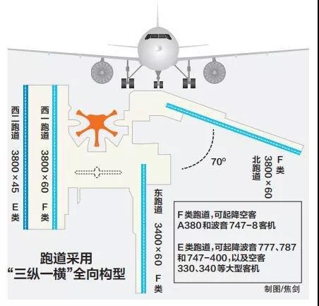 据悉,大兴机场飞行区四条跑道采用“三纵一横”全向构型,三条平行、一条侧向,在国内尚属首次。