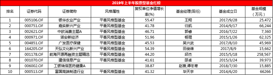 综合排名居首的是银华农业产业(005106),这是一只发起式基金,基金经理王翔。受非洲猪瘟事件影响,以往颇为沉寂的猪肉板块一跃成为今年上半年A股明星板块,多只猪肉股股价翻倍。银华农业产业基金重仓了温氏股份(300498.SZ)、牧原股份(002714.SZ)、正邦科技(002157.SZ)、圣农发展(002299.SZ)等标的股,使得该基金今年上半年净值暴涨55.47%。