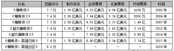 而今年推出的这部《蜘蛛侠:英雄远征》,在剧情走向和时间节点上,更是承接了《复仇者联盟4》的热度,豆瓣评分高达8.2分,率先通过中国市场完成口碑发酵,势必会在一定程度上助力其在北美市场上的表现。