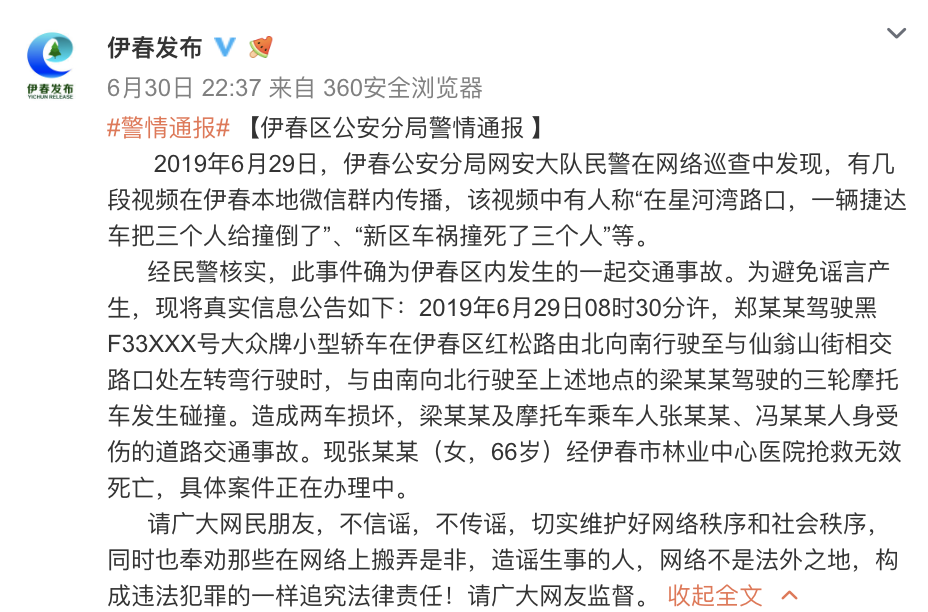 中共伊春市委宣传部官方微博通报:2019年6月29日,伊春公安分局网安大队民警在网络巡查中发现,有几段视频在伊春本地微信群内传播,该视频中有人称“在星河湾路口,一辆捷达车把三个人给撞倒了”、“新区车祸撞死了三个人”等。