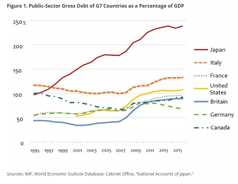 图1显示了七国集团(G7)债务与GDP的比率。日本与G7其他国家的不同之处在于,不仅日本的公共债务水平高得多,而且这一比例还在以惊人的速度增长,目前已接近250%。这甚至比二战刚结束时还要高。事实上,在历史上,一个工业国家的公共部门债务在和平时期从未超过GDP的200%。