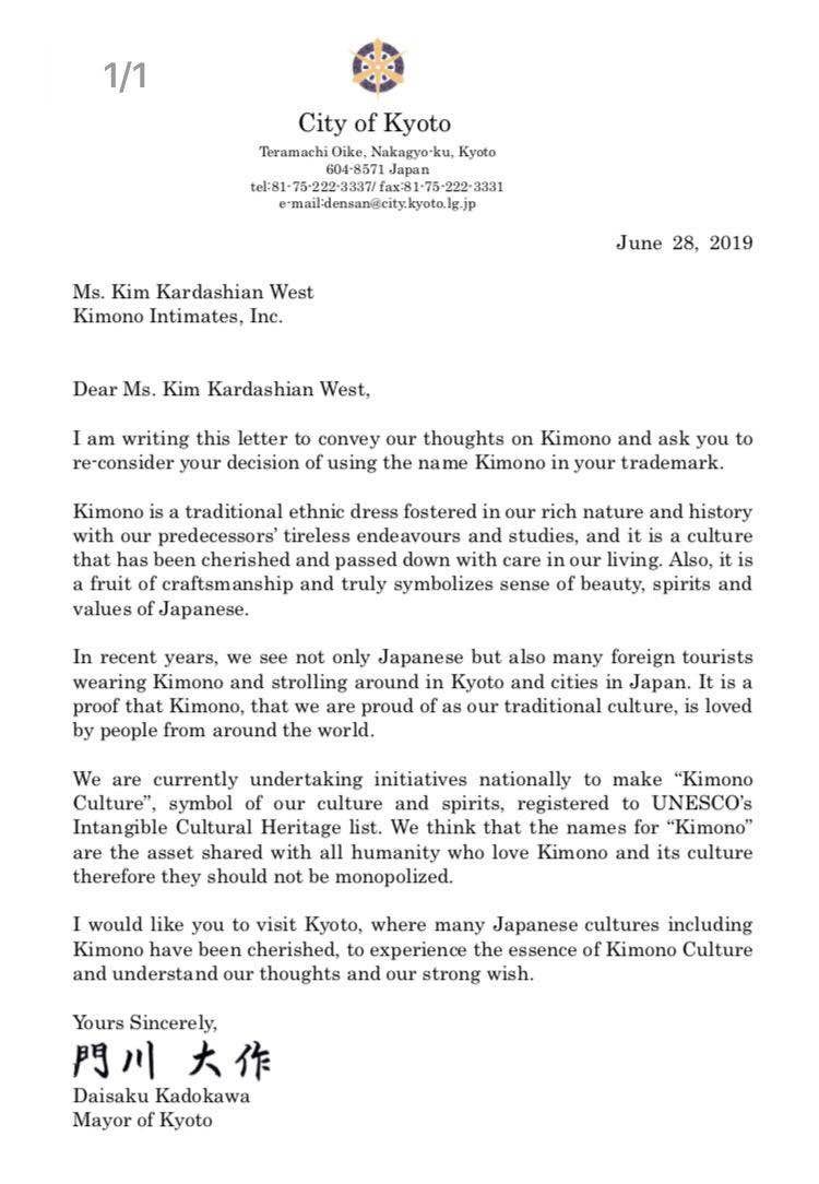 6月28日,京都市长门川大作向卡戴珊发了一封公开信,信中建议她重新考虑注册“和服”为品牌商标一事。