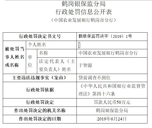 银保监会网站日前公布一张对中国农业发展银行鹤岗市分行的罚单显示,该分行因贷前调查不到位“吃”50万元罚款。