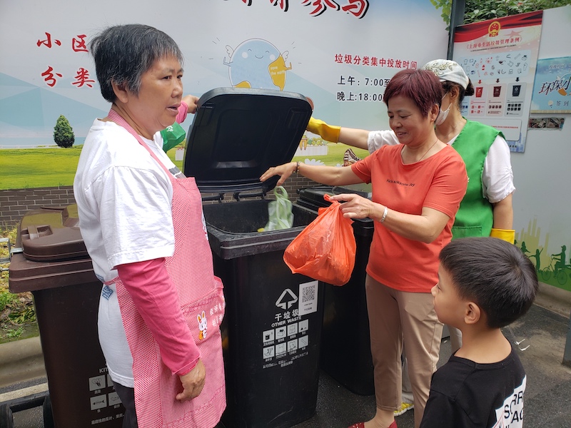 从3月12日起,小区便正式实施干湿垃圾分类,并定时定点按规投放。该社区居委会党支书介绍:“之前是每栋楼下都有一个绿色的垃圾桶,3月12号之后换成每两栋楼之间设干、湿两个垃圾桶。实施一段时间后,居民有了一定的分类意识,我们就在5月份撤桶,改造了一个定时定点投放的垃圾站,由专人负责。居民还可以下载‘大场e社区’APP,倒完垃圾扫垃圾桶上的二维码,攒积分换礼品。”