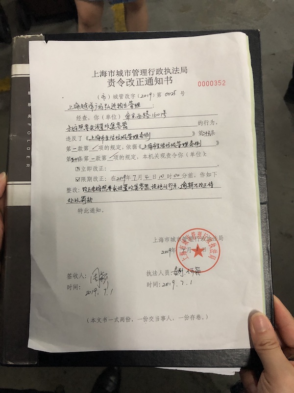 对此,上海市城管局执法总队机动执法队二分队开出了第三张责令整改书。