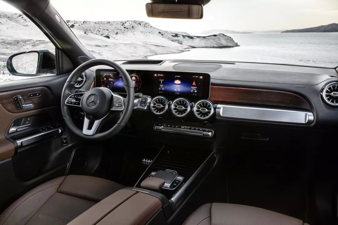 相比外观,GLB在内饰层面上就没有太多悬念了,不过它也不会令人失望,毕竟GLB和新款A级轿车以及新CLA一样都是出自MFA2平台,使用同样的家族式内装在情理之中,非对称布局、组合式大屏、涡轮状的空调出风口等元素构成了GLB的内饰视觉。