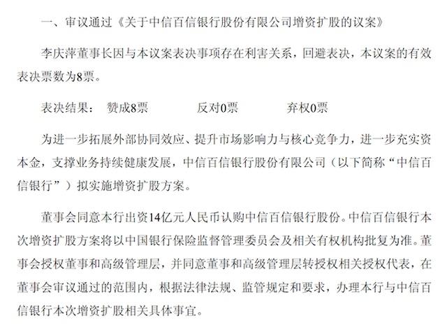 6月27日晚间,中信银行发布公告称, 为进一步拓展外部协同效应、提升市场影响力与核心竞争力,进一步充实资本金,支撑业务持续健康发展,中信百信银行股份有限公司("中信百信银行")拟实施增资扩股方案。董事会同意该行出资14亿元人民币认购中信百信银行股份。
