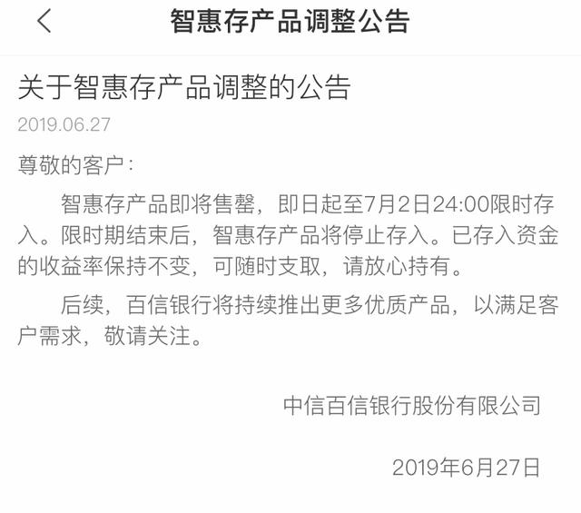 新金融头条还注意到,6月27日,百信银行发布《关于智惠存产品调整的公告》,称智惠存产品即将售罄,即日起至7月2日24:00限时存入。限时期结束后,智惠存产品将停止存入。已存入资金的收益率保持不变,可随时支取。