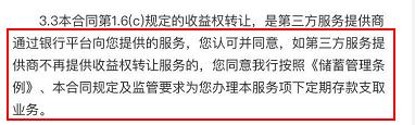 但是,产品服务合同还规定,该等收益权转让的具体要求、条件及流程(包括付款流程)以收益权转让合同的规定为准。如果第三方服务提供商不再提供收益权转让服务,那么智惠存将按照继续按普通定期存款来运作。也就是说,如果用户在未满五年存期之前取出钱来而第三方服务提供商不再提供收益权转让服务,就要按活期利率计息。