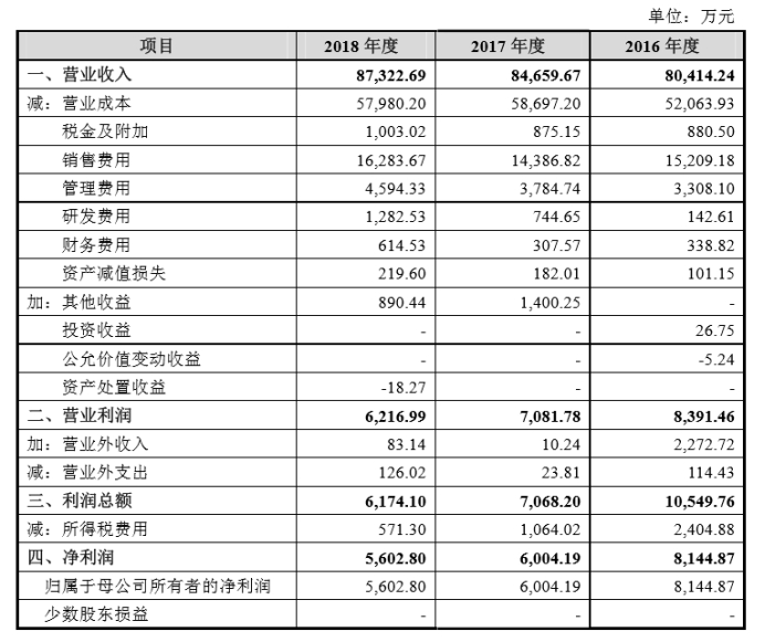 事实上,溜溜果园近三年的增势略显缓慢。根据招股书显示,溜溜果园2018年收入为8.73亿元,比2017年的8.47亿元增长3%。虽然营业收入在2016-2018年间持续微增,但净利润却三年连续降低,分别为0.81亿元、0.60亿元和0.56亿元。