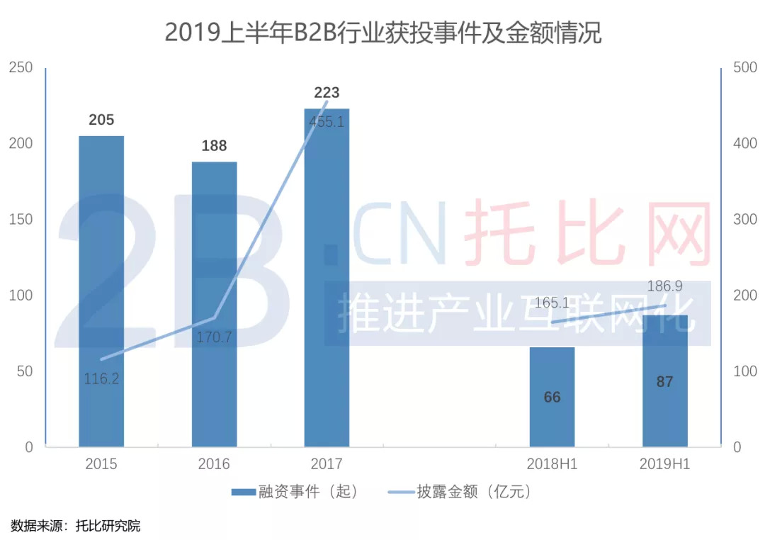 图1:2019上半年B2B行业获投事件及金额情况 图片来源:托比网